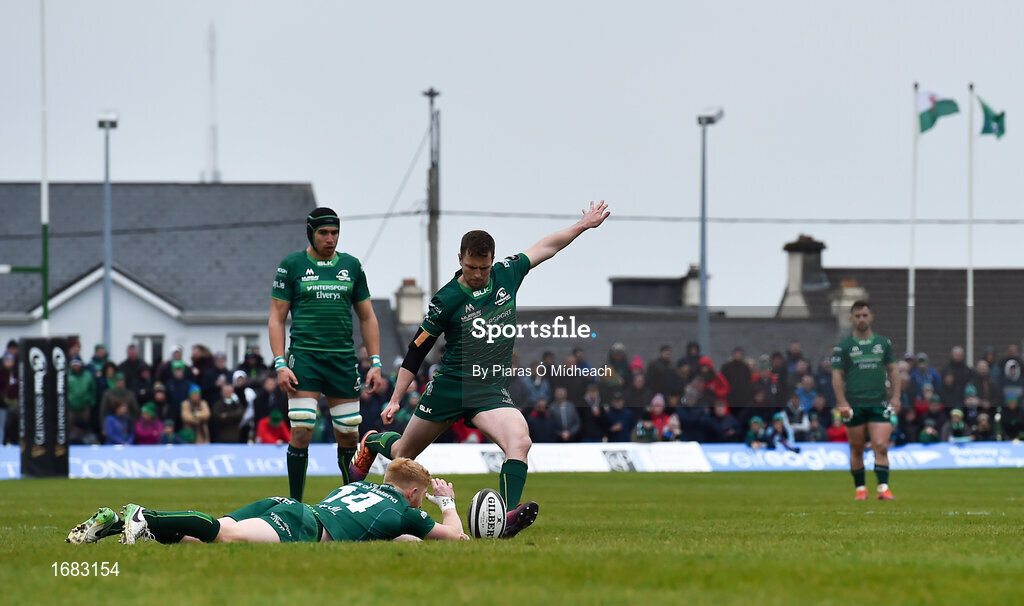 13 April 2019; Jack Carty of Connacht takes a kick at goal, as team-mate Darragh Leader holds the ball in place for him, during the Guinness PRO14 Round 20 match between Connacht and Cardiff Blues at The Sportsground in Galway. Photo by Piaras Ó Mídheach/Sportsfile