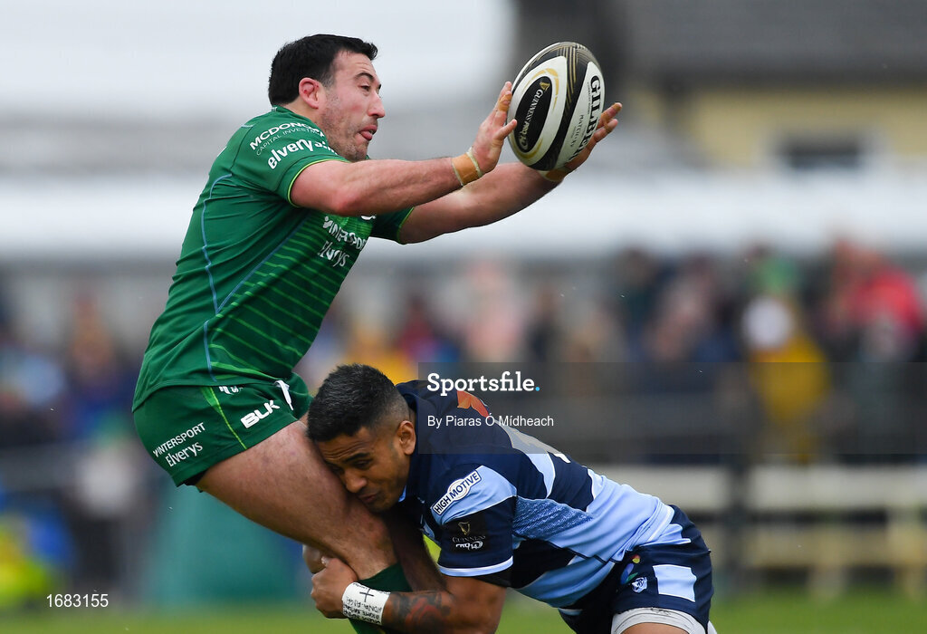 13 April 2019; Denis Buckley of Connacht is tackled by Rey Lee-Lo of Cardiff Blues during the Guinness PRO14 Round 20 match between Connacht and Cardiff Blues at The Sportsground in Galway. Photo by Piaras Ó Mídheach/Sportsfile