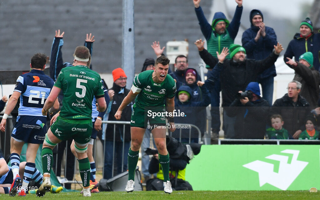 13 April 2019; Tom Farrell of Connacht celebrates a second half try scored by team-mate Matt Healy during the Guinness PRO14 Round 20 match between Connacht and Cardiff Blues at The Sportsground in Galway. Photo by Piaras Ó Mídheach/Sportsfile