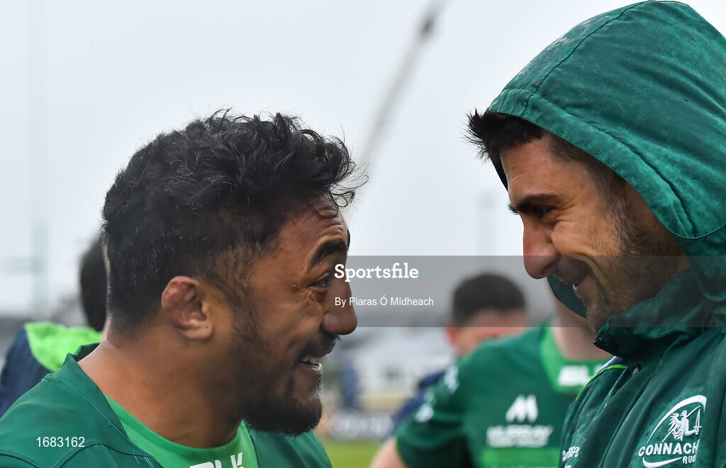 13 April 2019; Connacht players Bundee Aki, left, and Tiernan O’Halloran celebrate after the Guinness PRO14 Round 20 match between Connacht and Cardiff Blues at The Sportsground in Galway. Photo by Piaras Ó Mídheach/Sportsfile