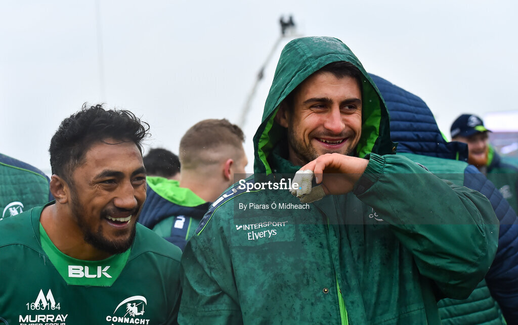 13 April 2019; Connacht players Bundee Aki, left, and Tiernan O’Halloran celebrate after the Guinness PRO14 Round 20 match between Connacht and Cardiff Blues at The Sportsground in Galway. Photo by Piaras Ó Mídheach/Sportsfile