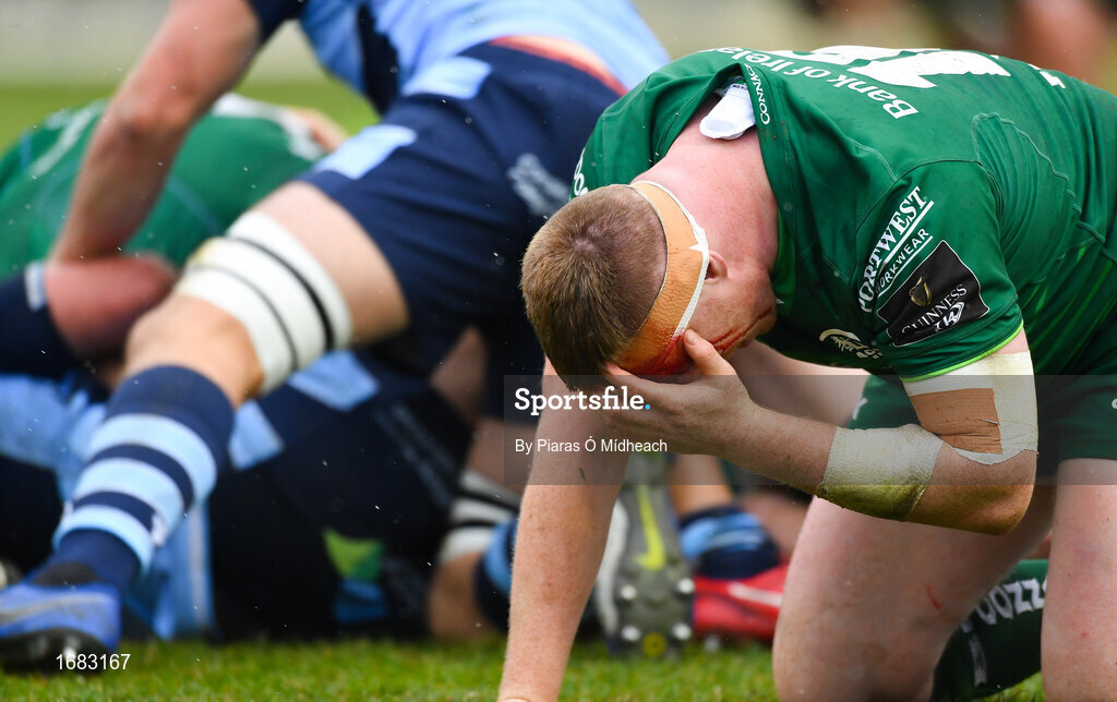 13 April 2019; Shane Delahunt of Connacht holds his head after picking up a blood injury during the Guinness PRO14 Round 20 match between Connacht and Cardiff Blues at The Sportsground in Galway. Photo by Piaras Ó Mídheach/Sportsfile