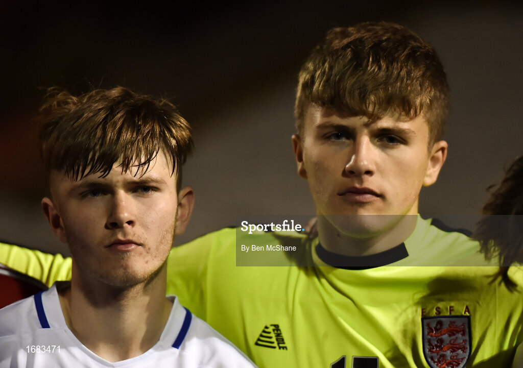 12 April 2019; Ethan Cartwright, left, and Jack Martin of England in the team huddle following the SAFIB Centenary Shield Under 18 Boys' International match between Republic of Ireland and England at Dalymount Park in Dublin. Photo by Ben McShane/Sportsfile