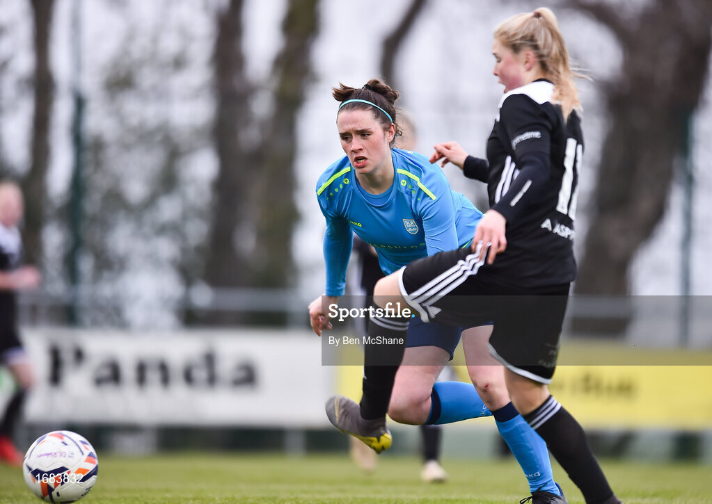 13 April 2019; Roisin McGovern of DLR Waves in action against Eabha O'Mahony of Cork City during the Só Hotels Women's National League match between DLR Waves and Cork City FC at Jackson Park in Kilternan, Dublin. Photo by Ben McShane/Sportsfile