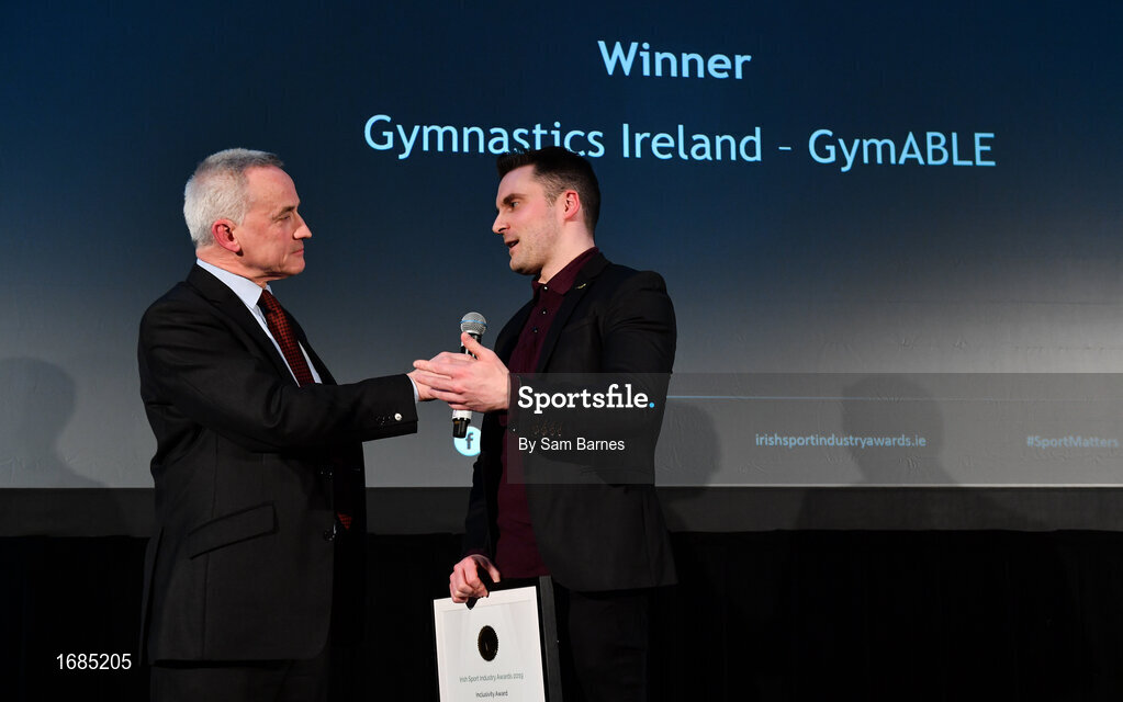15 April 2019; Kieran Gallagher of Gymnastics Ireland in conversation with Vincent Wall, MC and Newstalk Business Editor, after winning the Inclusivity Award, sponsored by JLT Insurance, during the Irish Sport Industry Awards presented by the Federation of Irish Sport at Crowne Plaza Blanchardstown. Photo by Sam Barnes/Sportsfile