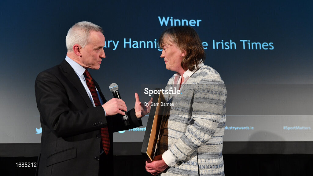 15 April 2019; Mary Hannigan of The Irish Times, right, in conversation with Vincent Wall, MC and Newstalk Business Editor, after winning the Jimmy Magee Sports Journalist of the Year Award during the Irish Sport Industry Awards presented by the Federation of Irish Sport at Crown Plaza Blanchardstown. Photo by Sam Barnes/Sportsfile