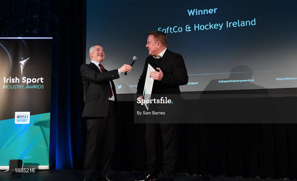 15 April 2019; Paul Tighe of Softco, in conversation with Vincent Wall, MC and Newstalk Business Editor, after winning the Sports Sponsorship of the Year Award, sponsored by AIB, by Paddy Somers, AIB Sponsorship Marketing Manager, during the Irish Sport Industry Awards presented by the Federation of Irish Sport at Crowne Plaza Blanchardstown. Photo by Sam Barnes/Sportsfile