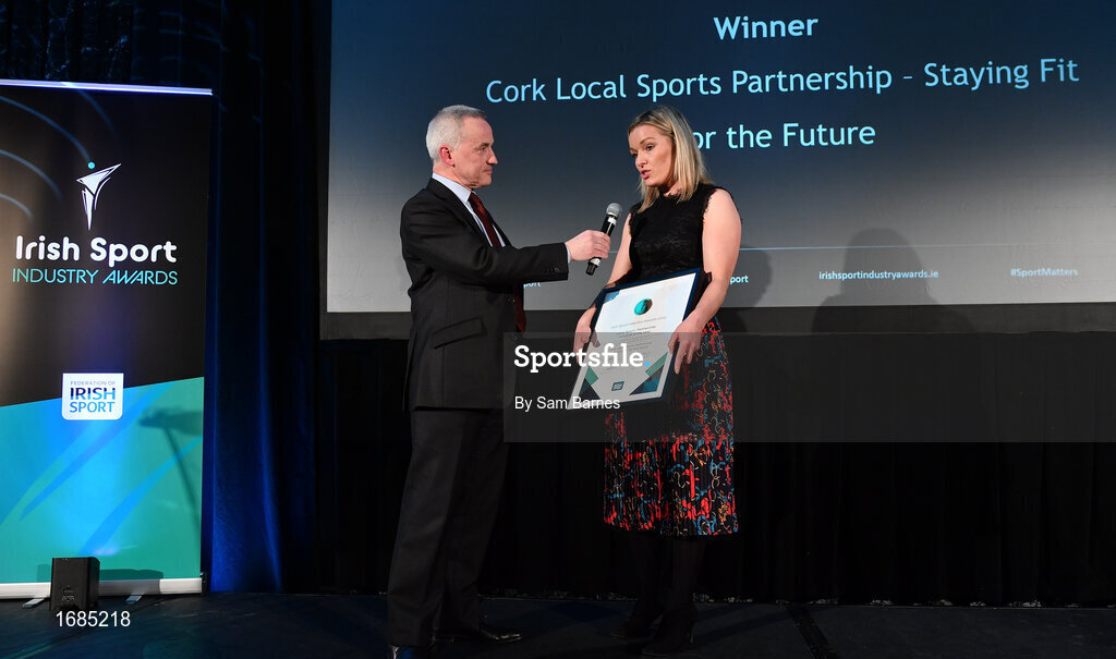 15 April 2019; Claire Hurley of Cork Local Sports Partnership in conversation with Vincent Wall, MC and Newstalk Business Editor, after winning the Local Sports Partnership Initiative of the Year Award during the Irish Sport Industry Awards presented by the Federation of Irish Sport at Crowne Plaza Blanchardstown. Photo by Sam Barnes/Sportsfile