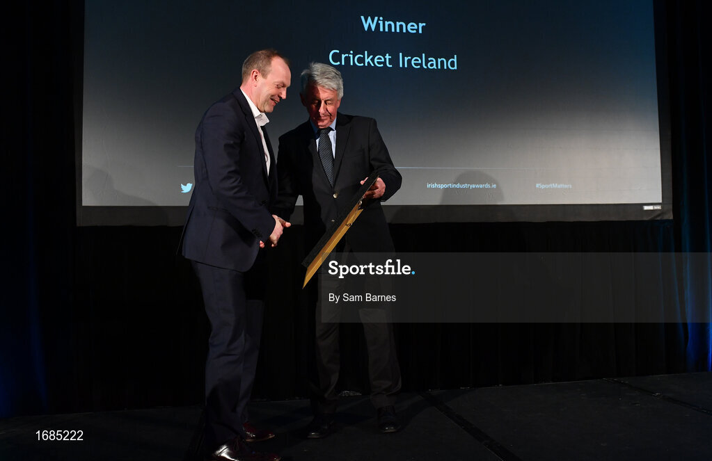 15 April 2019; Andrew May of Cricket Ireland, left, is presented with the National Governing Body of The Year Award by Roddy Guiney, Chairperson of the Federation of Irish Sport during the Irish Sport Industry Awards presented by the Federation of Irish Sport at Crowne Plaza Blanchardstown. Photo by Sam Barnes/Sportsfile