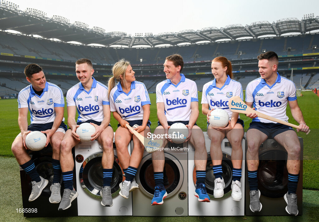 18 April 2019; Shane Mulligan of Mullinalaghta GAA Club, Longford, Conor McGill of Ratoath GAA Club, Meath, Grace Walsh of Tullaroan GAA Club, Kilkenny, Trevor Giles of Skyrne GAA Club, Meath, Lauren Magee of Kilmacud Crokes GAA Club, Dublin, and Martin Kavanagh of St Mullins GAA Club, Carlow, at the launch of the Beko Club Bua programme 2019, the quality mark for Leinster GAA clubs. For more information visit leinstergaa.ie/club-bua/. Photo by Stephen McCarthy/Sportsfile