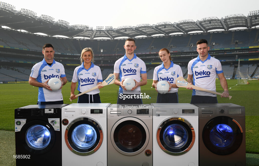 18 April 2019; Shane Mulligan of Mullinalaghta GAA Club, Longford, Grace Walsh of Tullaroan GAA Club, Kilkenny, Conor McGill of Ratoath GAA Club, Meath, Lauren Magee of Kilmacud Crokes GAA Club, Dublin, and Martin Kavanagh of St Mullins GAA Club, Carlow, at the launch of the Beko Club Bua programme 2019, the quality mark for Leinster GAA clubs. For more information visit leinstergaa.ie/club-bua/. Photo by Stephen McCarthy/Sportsfile