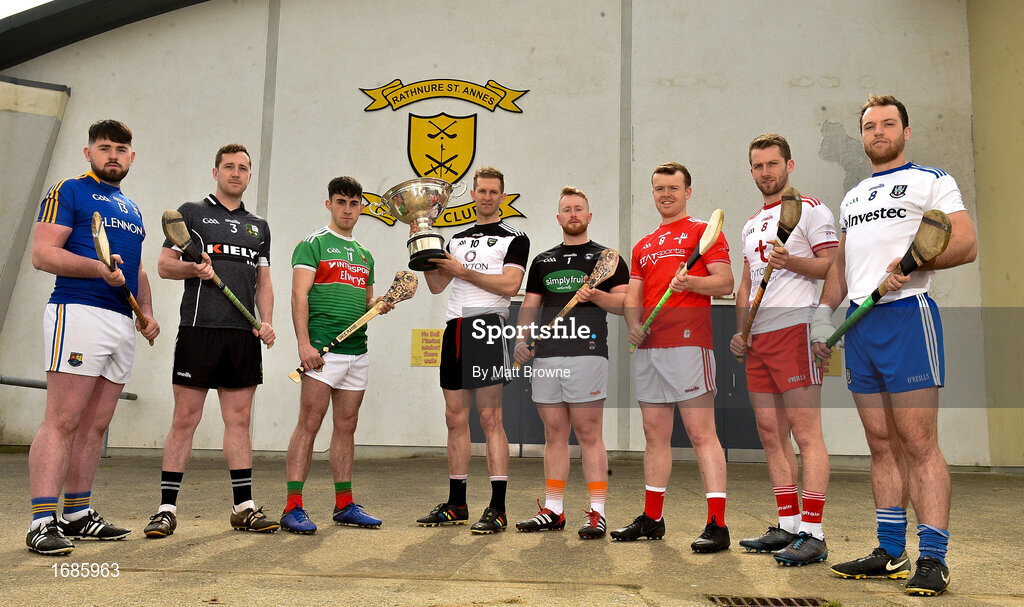 18 April 2019; Keith Raymond of Sligo with the Nicky Rackard Cup and from left Conor Gallagher of Longford, Dean Bruen of Warwickshire, Corey Scahill of Mayo, Simon Doherty of Armagh, David Stephenson of Louth, Dermot Begley of Tyrone and Kevin Crawley of Monaghan in attendance during the Nicky Rackard Cup Competition at the St Anne's GAA Club in Rathnure, Co. Wexford. Photo by Matt Browne/Sportsfile