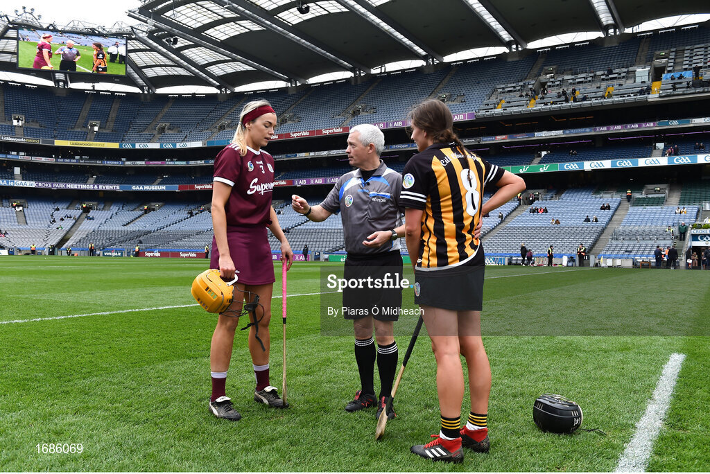 31 March 2019; Referee Cathal Egan with team captains Sarah Dervan of Galway and Anna Farrell of Kilkenny before the Littlewoods Ireland Camogie League Division 1 Final match between Kilkenny and Galway at Croke Park in Dublin. Photo by Piaras Ó Mídheach/Sportsfile