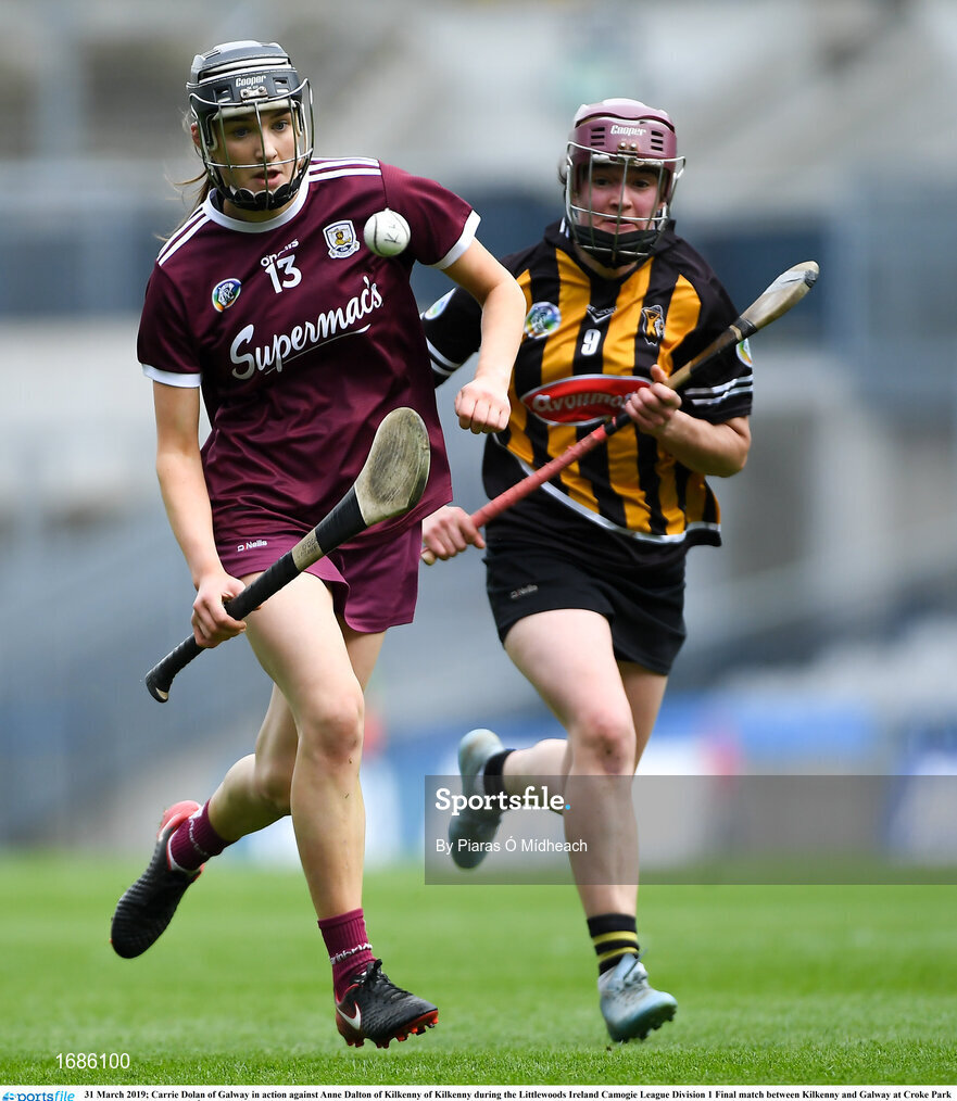 31 March 2019; Carrie Dolan of Galway in action against Anne Dalton of Kilkenny of Kilkenny during the Littlewoods Ireland Camogie League Division 1 Final match between Kilkenny and Galway at Croke Park in Dublin. Photo by Piaras Ó Mídheach/Sportsfile