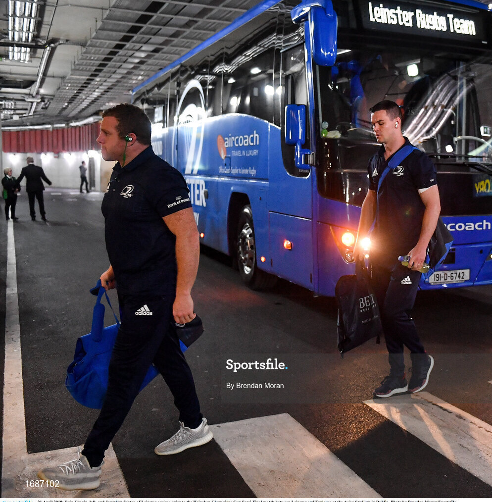 21 April 2019; Seán Cronin, left, and Jonathan Sexton of Leinster arrives prior to the Heineken Champions Cup Semi-Final match between Leinster and Toulouse at the Aviva Stadium in Dublin. Photo by Brendan Moran/Sportsfile