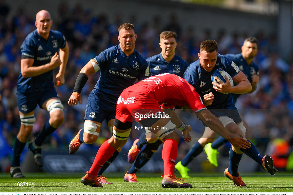 21 April 2019; Jack Conan of Leinster is tackled by Jerome Kaino of Toulouse during the Heineken Champions Cup Semi-Final match between Leinster and Toulouse at the Aviva Stadium in Dublin. Photo by Ramsey Cardy/Sportsfile