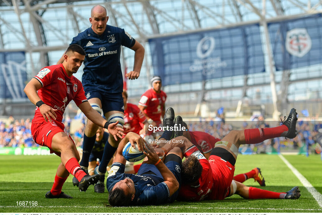 21 April 2019; James Lowe of Leinster scores his side's first try during the Heineken Champions Cup Semi-Final match between Leinster and Toulouse at the Aviva Stadium in Dublin. Photo by Ramsey Cardy/Sportsfile