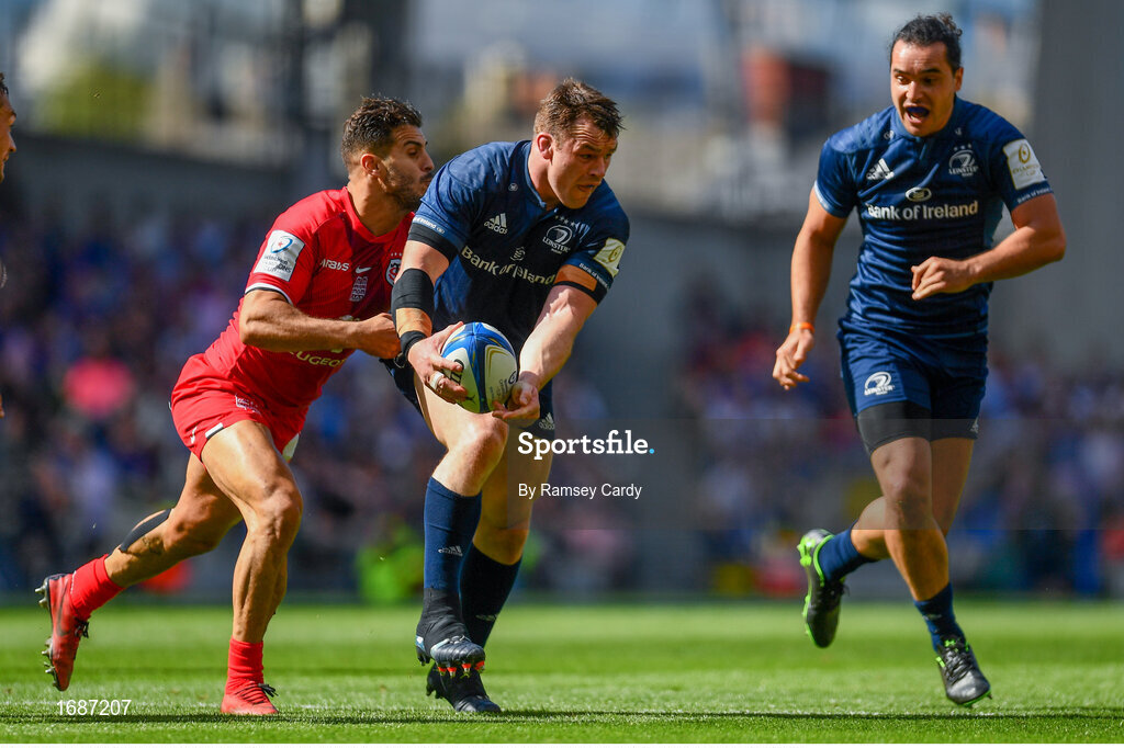 21 April 2019; Cian Healy of Leinster is tackled by Sofiane Guitoune of Toulouse during the Heineken Champions Cup Semi-Final match between Leinster and Toulouse at the Aviva Stadium in Dublin. Photo by Ramsey Cardy/Sportsfile