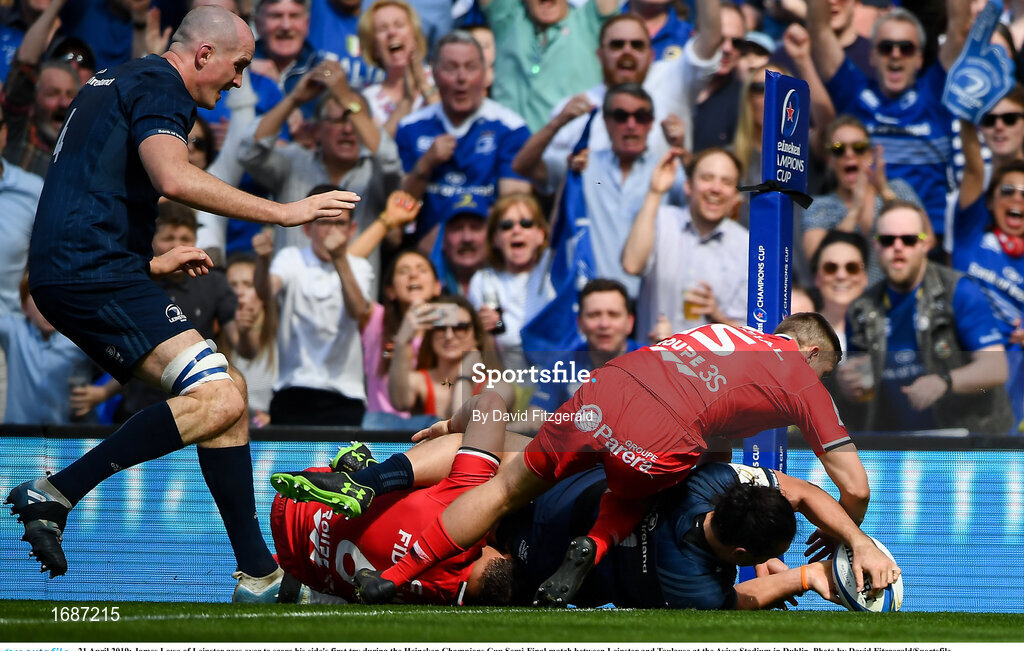 21 April 2019; James Lowe of Leinster goes over to score his side's first try during the Heineken Champions Cup Semi-Final match between Leinster and Toulouse at the Aviva Stadium in Dublin. Photo by David Fitzgerald/Sportsfile