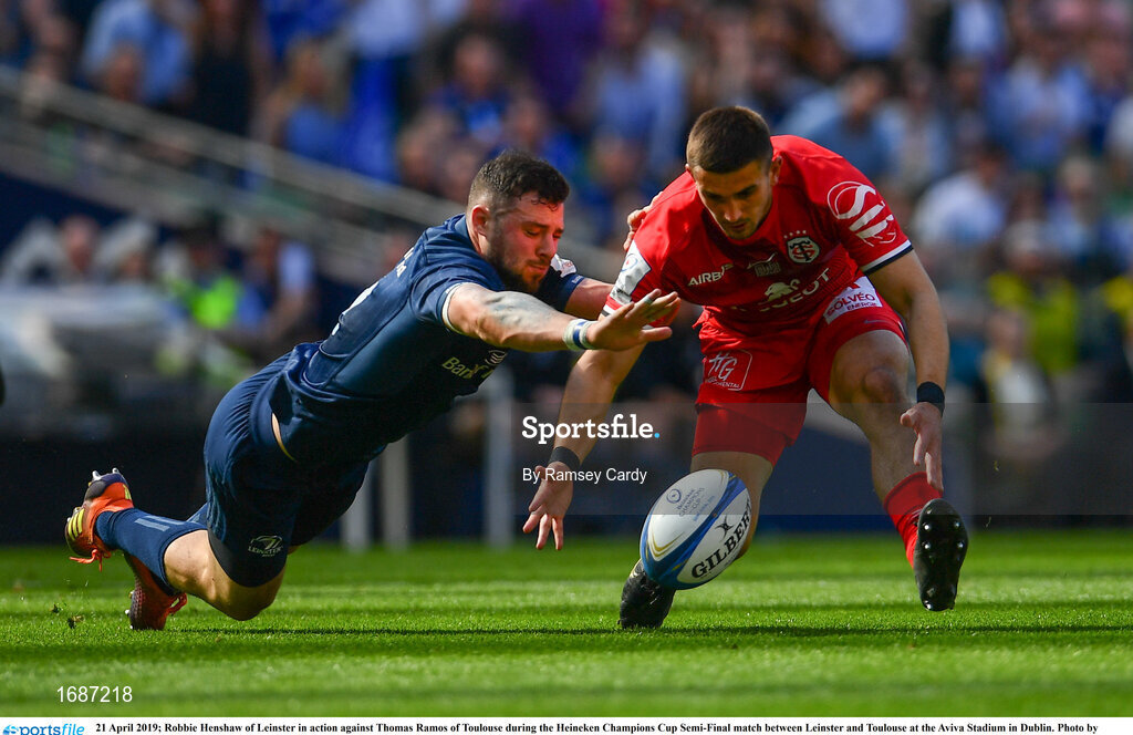 21 April 2019; Robbie Henshaw of Leinster in action against Thomas Ramos of Toulouse during the Heineken Champions Cup Semi-Final match between Leinster and Toulouse at the Aviva Stadium in Dublin. Photo by Ramsey Cardy/Sportsfile