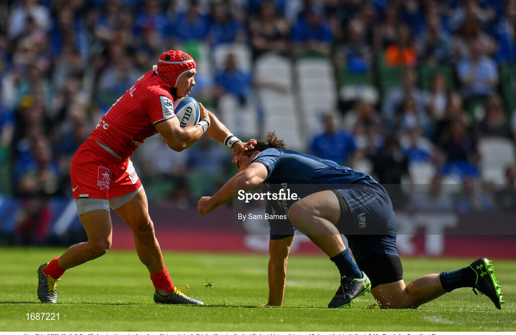 21 April 2019; Cheslin Kolbe of Toulouse in action against James Lowe of Leinster during the Heineken Champions Cup Semi-Final match between Leinster and Toulouse at the Aviva Stadium in Dublin. Photo by Sam Barnes/Sportsfile