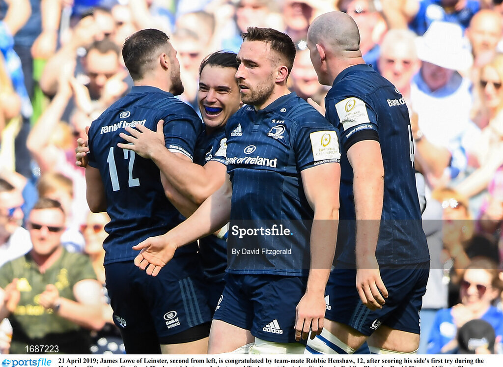 21 April 2019; James Lowe of Leinster, second from left, is congratulated by team-mate Robbie Henshaw, 12, after scoring his side's first try during the Heineken Champions Cup Semi-Final match between Leinster and Toulouse at the Aviva Stadium in Dublin. Photo by David Fitzgerald/Sportsfile