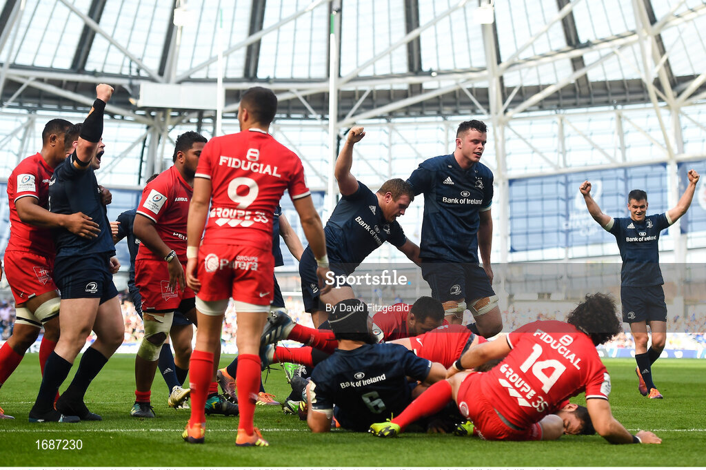 21 April 2019; Leinster players celebrate after Scott Fardy of Leinster scores his side's second try during the Heineken Champions Cup Semi-Final match between Leinster and Toulouse at the Aviva Stadium in Dublin. Photo by David Fitzgerald/Sportsfile
