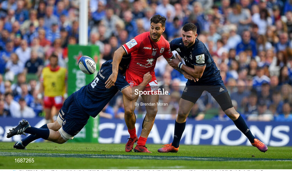 21 April 2019; Sofiane Guitoune of Toulouse is tackled by Scott Fardy and Robbie Henshaw of Leinster during the Heineken Champions Cup Semi-Final match between Leinster and Toulouse at the Aviva Stadium in Dublin. Photo by Brendan Moran/Sportsfile