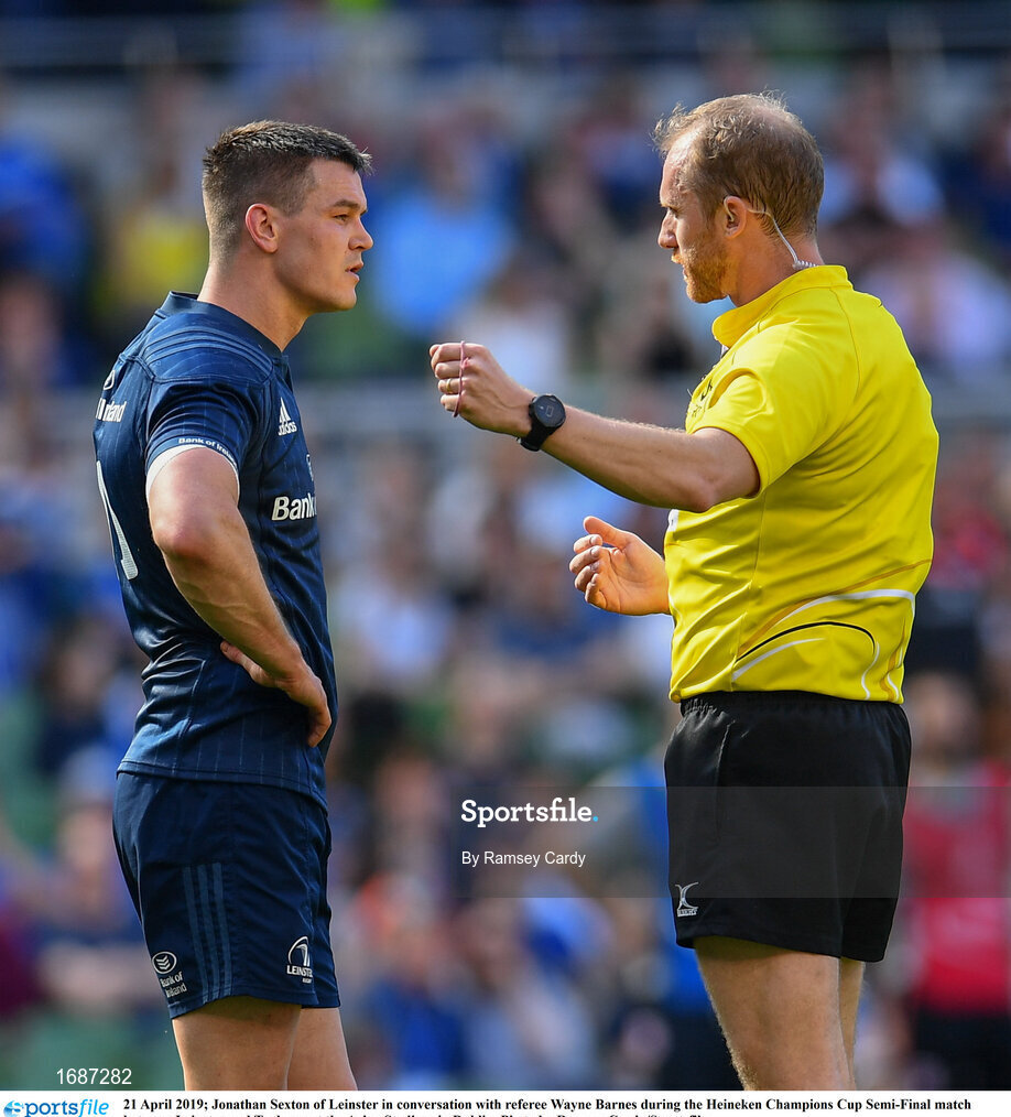 21 April 2019; Jonathan Sexton of Leinster in conversation with referee Wayne Barnes during the Heineken Champions Cup Semi-Final match between Leinster and Toulouse at the Aviva Stadium in Dublin. Photo by Ramsey Cardy/Sportsfile