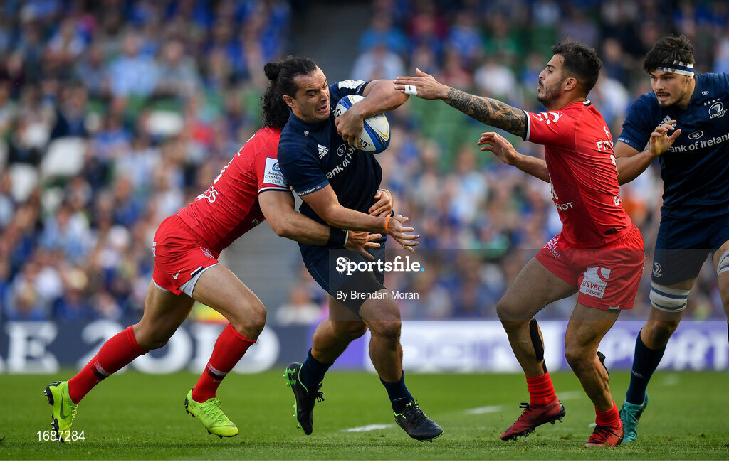 21 April 2019; James Lowe of Leinster is tackled by Yoann Huget and Sébastien Bézy of Toulouse during the Heineken Champions Cup Semi-Final match between Leinster and Toulouse at the Aviva Stadium in Dublin. Photo by Brendan Moran/Sportsfile