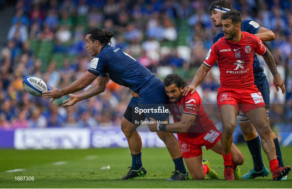 21 April 2019; James Lowe of Leinster is tackled by Yoann Huget of Toulouse during the Heineken Champions Cup Semi-Final match between Leinster and Toulouse at the Aviva Stadium in Dublin. Photo by Brendan Moran/Sportsfile