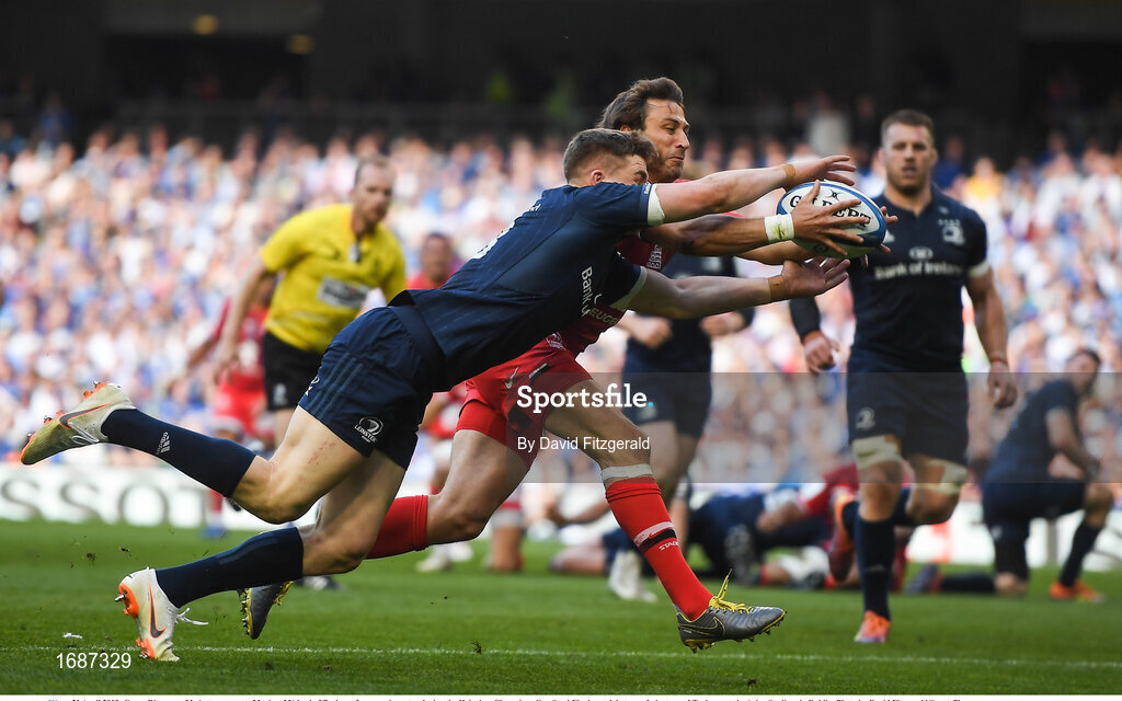 21 April 2019; Garry Ringrose of Leinster prevents Maxime Médard of Toulouse from scoring a try during the Heineken Champions Cup Semi-Final match between Leinster and Toulouse at the Aviva Stadium in Dublin. Photo by David Fitzgerald/Sportsfile