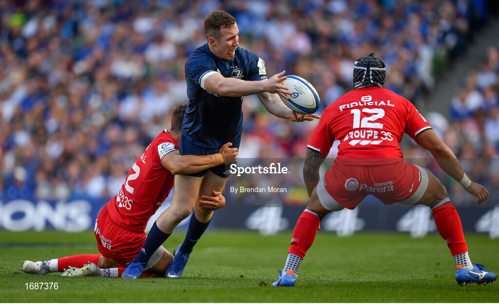 21 April 2019; Rory O'Loughlin of Leinster is tackled by Romain Ntamack of Toulouse during the Heineken Champions Cup Semi-Final match between Leinster and Toulouse at the Aviva Stadium in Dublin. Photo by Brendan Moran/Sportsfile