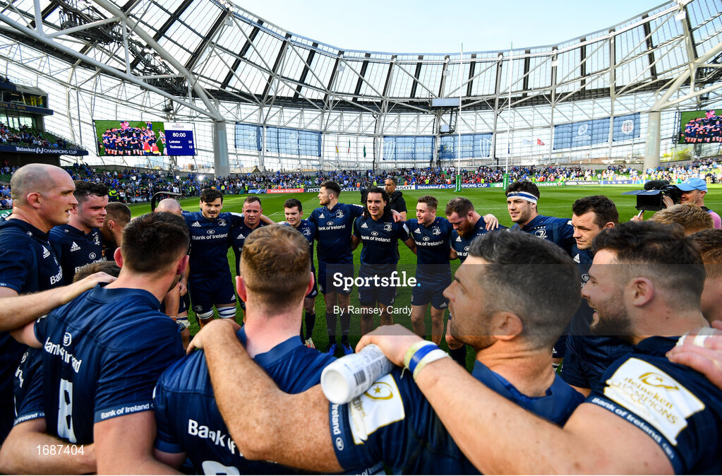 21 April 2019; The Leinster team huddle following the Heineken Champions Cup Semi-Final match between Leinster and Toulouse at the Aviva Stadium in Dublin. Photo by Ramsey Cardy/Sportsfile