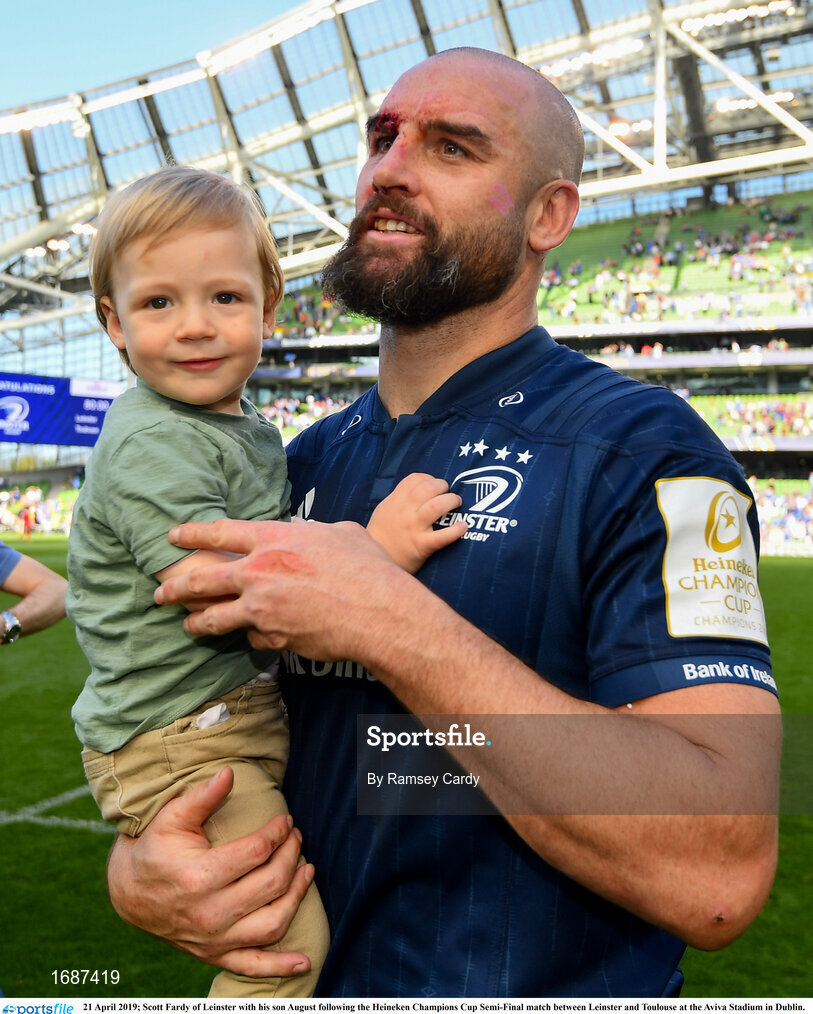 21 April 2019; Scott Fardy of Leinster with his son August following the Heineken Champions Cup Semi-Final match between Leinster and Toulouse at the Aviva Stadium in Dublin. Photo by Ramsey Cardy/Sportsfile