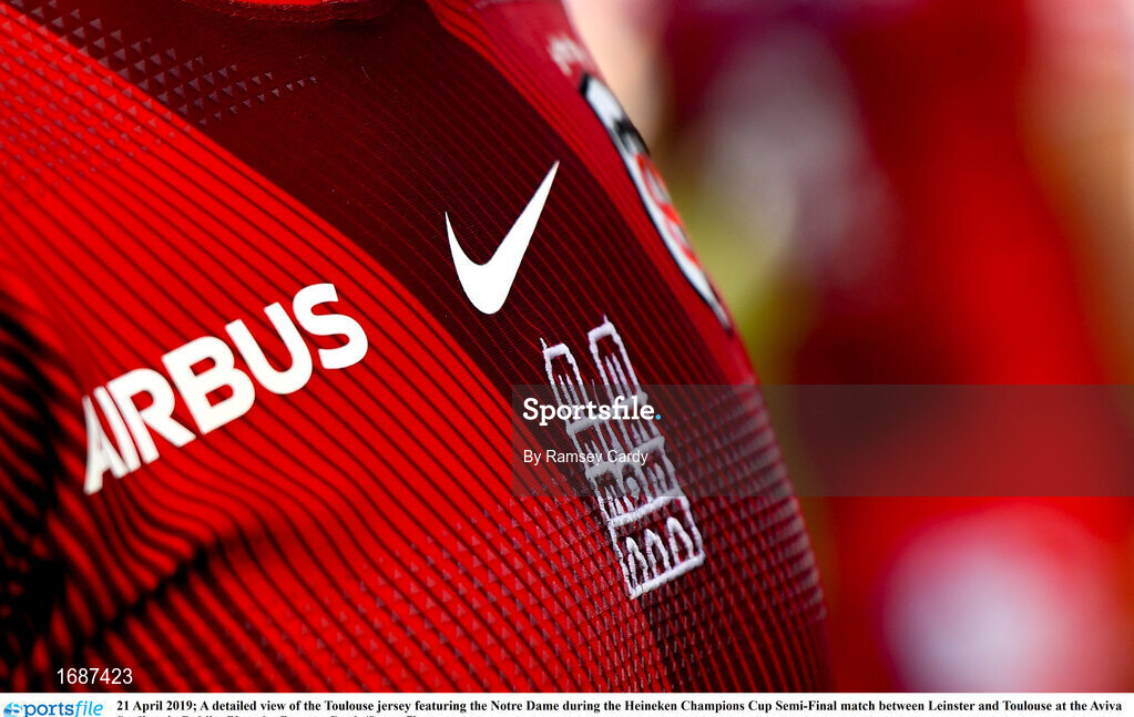 21 April 2019; A detailed view of the Toulouse jersey featuring the Notre Dame during the Heineken Champions Cup Semi-Final match between Leinster and Toulouse at the Aviva Stadium in Dublin. Photo by Ramsey Cardy/Sportsfile
