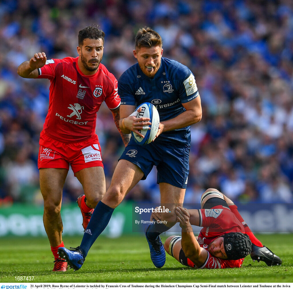21 April 2019; Ross Byrne of Leinster is tackled by Francois Cros of Toulouse during the Heineken Champions Cup Semi-Final match between Leinster and Toulouse at the Aviva Stadium in Dublin. Photo by Ramsey Cardy/Sportsfile
