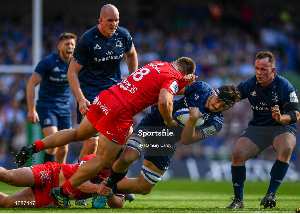 21 April 2019; Max Deegan of Leinster is tackled by Maks Van Dyk of Toulouse during the Heineken Champions Cup Semi-Final match between Leinster and Toulouse at the Aviva Stadium in Dublin. Photo by Ramsey Cardy/Sportsfile