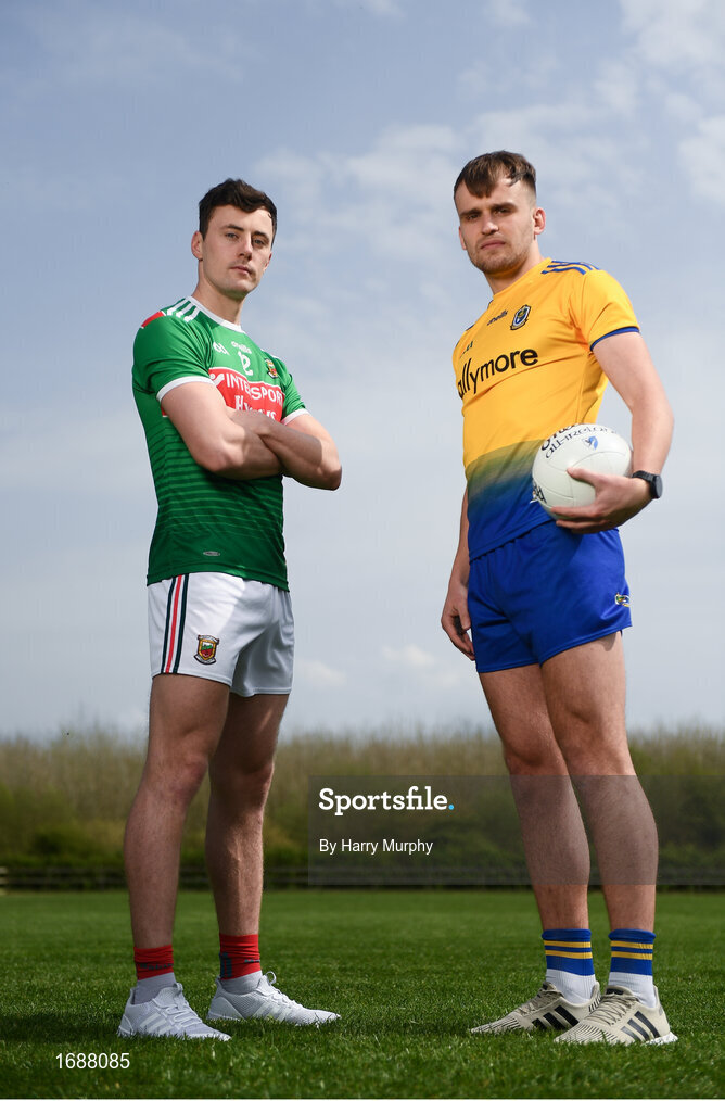 23 April 2019; Diarmuid O'Connor of Mayo, left, and Enda Smith of Roscommon at the official launch of the 2019 Connacht GAA Football Championships at Connacht GAA Centre in Claremorris, Co. Mayo. Photo by Harry Murphy/Sportsfile