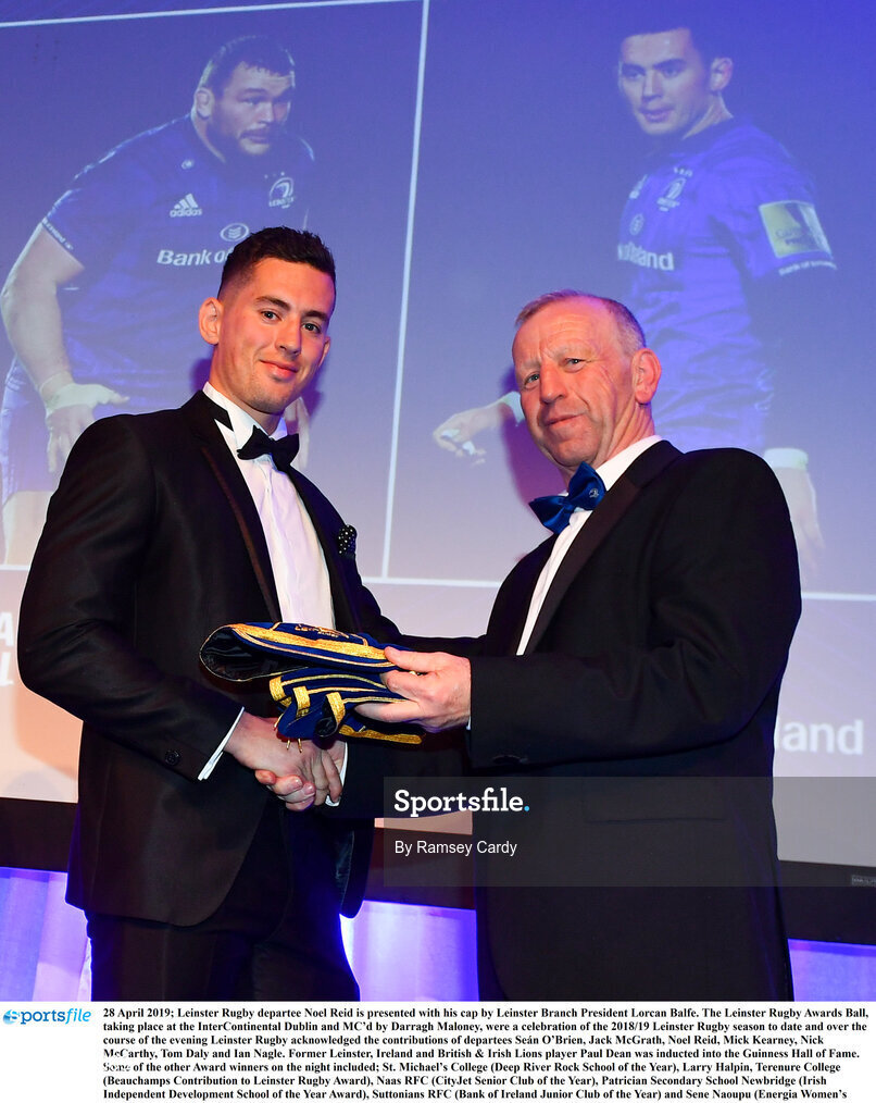 28 April 2019; Leinster Rugby departee Noel Reid is presented with his cap by Leinster Branch President Lorcan Balfe. The Leinster Rugby Awards Ball, taking place at the InterContinental Dublin and MC’d by Darragh Maloney, were a celebration of the 2018/19 Leinster Rugby season to date and over the course of the evening Leinster Rugby acknowledged the contributions of departees Seán O’Brien, Jack McGrath, Noel Reid, Mick Kearney, Nick McCarthy, Tom Daly and Ian Nagle. Former Leinster, Ireland and British & Irish Lions player Paul Dean was inducted into the Guinness Hall of Fame. Some of the other Award winners on the night included; St. Michael’s College (Deep River Rock School of the Year), Larry Halpin, Terenure College (Beauchamps Contribution to Leinster Rugby Award), Naas RFC (CityJet Senior Club of the Year), Patrician Secondary School Newbridge (Irish Independent Development School of the Year Award), Suttonians RFC (Bank of Ireland Junior Club of the Year) and Sene Naoupu (Energia Women’s Rugby Award). Photo by Ramsey Cardy/Sportsfile