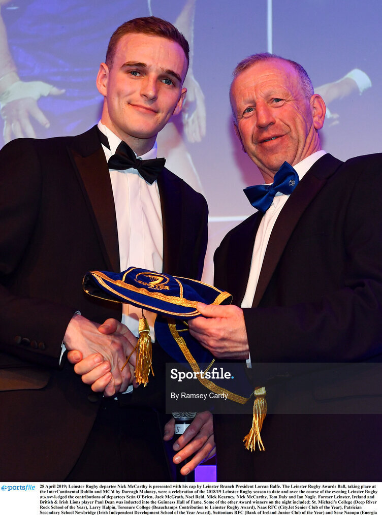 28 April 2019; Leinster Rugby departee Nick McCarthy is presented with his cap by Leinster Branch President Lorcan Balfe. The Leinster Rugby Awards Ball, taking place at the InterContinental Dublin and MC’d by Darragh Maloney, were a celebration of the 2018/19 Leinster Rugby season to date and over the course of the evening Leinster Rugby acknowledged the contributions of departees Seán O’Brien, Jack McGrath, Noel Reid, Mick Kearney, Nick McCarthy, Tom Daly and Ian Nagle. Former Leinster, Ireland and British & Irish Lions player Paul Dean was inducted into the Guinness Hall of Fame. Some of the other Award winners on the night included; St. Michael’s College (Deep River Rock School of the Year), Larry Halpin, Terenure College (Beauchamps Contribution to Leinster Rugby Award), Naas RFC (CityJet Senior Club of the Year), Patrician Secondary School Newbridge (Irish Independent Development School of the Year Award), Suttonians RFC (Bank of Ireland Junior Club of the Year) and Sene Naoupu (Energia Women’s Rugby Award). Photo by Ramsey Cardy/Sportsfile