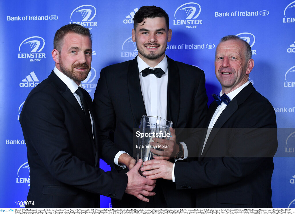 28 April 2019; Max Deegan is presented with the Laya Healthcare Young Player of the Year award by D.O. O’Connor, left, Deputy Managing Director, Laya Healthcare, in the company of Leinster Branch President Lorcan Balfe. The Leinster Rugby Awards Ball, taking place at the InterContinental Dublin and MC’d by Darragh Maloney, were a celebration of the 2018/19 Leinster Rugby season to date and over the course of the evening Leinster Rugby acknowledged the contributions of departees Seán O’Brien, Jack McGrath, Noel Reid, Mick Kearney, Nick McCarthy, Tom Daly and Ian Nagle. Former Leinster, Ireland and British & Irish Lions player Paul Dean was inducted into the Guinness Hall of Fame. Some of the other Award winners on the night included; St. Michael’s College (Deep River Rock School of the Year), Larry Halpin, Terenure College (Beauchamps Contribution to Leinster Rugby Award), Naas RFC (CityJet Senior Club of the Year), Patrician Secondary School Newbridge (Irish Independent Development School of the Year Award), Suttonians RFC (Bank of Ireland Junior Club of the Year) and Sene Naoupu (Energia Women’s Rugby Award). Photo by Brendan Moran/Sportsfile