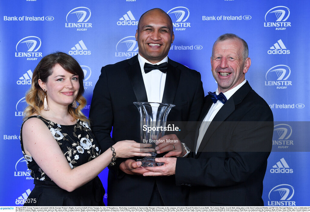 28 April 2019; George Naoupu is presented with the Energia Women’s Rugby Award on behalf of Sene Naoupu, by Amy O’Shaughnessy, Marketing Acquisitions & Sponsorship Manager of Energia, in the company of Leinster Branch President Lorcan Balfe. The Leinster Rugby Awards Ball, taking place at the InterContinental Dublin and MC’d by Darragh Maloney, were a celebration of the 2018/19 Leinster Rugby season to date and over the course of the evening Leinster Rugby acknowledged the contributions of departees Seán O’Brien, Jack McGrath, Noel Reid, Mick Kearney, Nick McCarthy, Tom Daly and Ian Nagle. Former Leinster, Ireland and British & Irish Lions player Paul Dean was inducted into the Guinness Hall of Fame. Some of the other Award winners on the night included; St. Michael’s College (Deep River Rock School of the Year), Larry Halpin, Terenure College (Beauchamps Contribution to Leinster Rugby Award), Naas RFC (CityJet Senior Club of the Year), Patrician Secondary School Newbridge (Irish Independent Development School of the Year Award), Suttonians RFC (Bank of Ireland Junior Club of the Year) and Sene Naoupu (Energia Women’s Rugby Award). Photo by Brendan Moran/Sportsfile