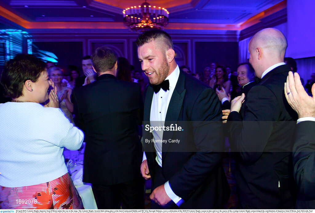 28 April 2019; Leinster Rugby departee Sean O'Brien makes his way to the stage. The Leinster Rugby Awards Ball, taking place at the InterContinental Dublin and MC’d by Darragh Maloney, were a celebration of the 2018/19 Leinster Rugby season to date and over the course of the evening Leinster Rugby acknowledged the contributions of departees Seán O’Brien, Jack McGrath, Noel Reid, Mick Kearney, Nick McCarthy, Tom Daly and Ian Nagle. Former Leinster, Ireland and British & Irish Lions player Paul Dean was inducted into the Guinness Hall of Fame. Some of the other Award winners on the night included; St. Michael’s College (Deep River Rock School of the Year), Larry Halpin, Terenure College (Beauchamps Contribution to Leinster Rugby Award), Naas RFC (CityJet Senior Club of the Year), Patrician Secondary School Newbridge (Irish Independent Development School of the Year Award), Suttonians RFC (Bank of Ireland Junior Club of the Year) and Sene Naoupu (Energia Women’s Rugby Award). Photo by Ramsey Cardy/Sportsfile