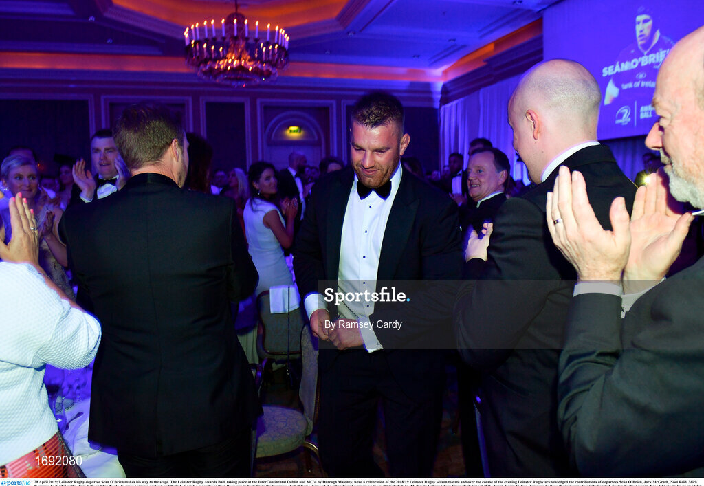 28 April 2019; Leinster Rugby departee Sean O'Brien makes his way to the stage. The Leinster Rugby Awards Ball, taking place at the InterContinental Dublin and MC’d by Darragh Maloney, were a celebration of the 2018/19 Leinster Rugby season to date and over the course of the evening Leinster Rugby acknowledged the contributions of departees Seán O’Brien, Jack McGrath, Noel Reid, Mick Kearney, Nick McCarthy, Tom Daly and Ian Nagle. Former Leinster, Ireland and British & Irish Lions player Paul Dean was inducted into the Guinness Hall of Fame. Some of the other Award winners on the night included; St. Michael’s College (Deep River Rock School of the Year), Larry Halpin, Terenure College (Beauchamps Contribution to Leinster Rugby Award), Naas RFC (CityJet Senior Club of the Year), Patrician Secondary School Newbridge (Irish Independent Development School of the Year Award), Suttonians RFC (Bank of Ireland Junior Club of the Year) and Sene Naoupu (Energia Women’s Rugby Award). Photo by Ramsey Cardy/Sportsfile