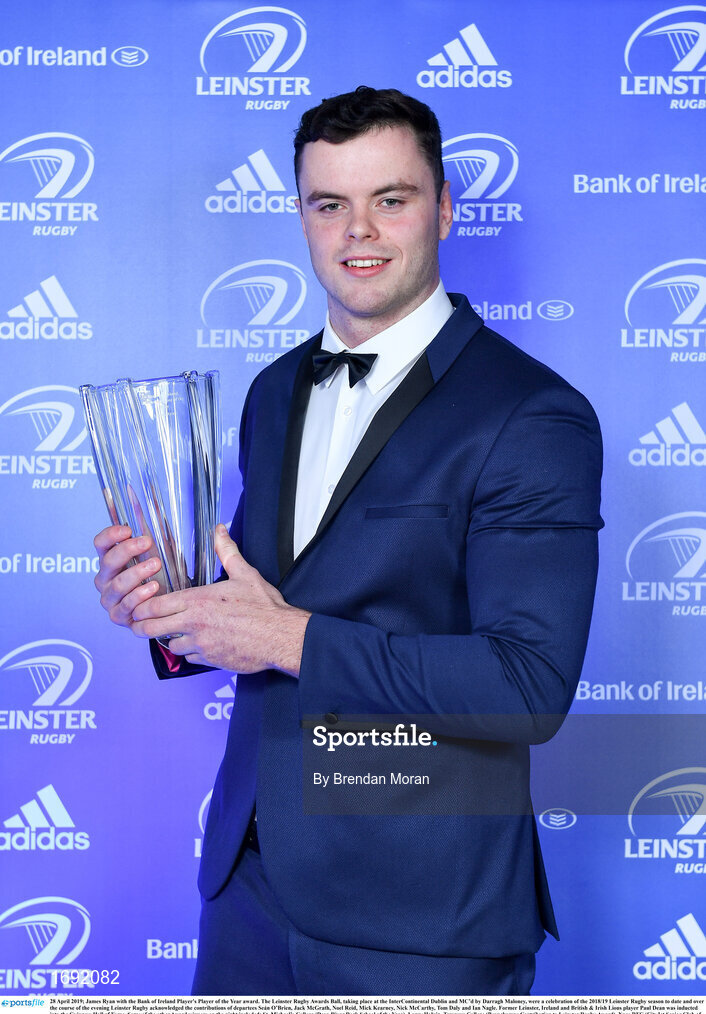 28 April 2019; James Ryan with the Bank of Ireland Player's Player of the Year award. The Leinster Rugby Awards Ball, taking place at the InterContinental Dublin and MC’d by Darragh Maloney, were a celebration of the 2018/19 Leinster Rugby season to date and over the course of the evening Leinster Rugby acknowledged the contributions of departees Seán O’Brien, Jack McGrath, Noel Reid, Mick Kearney, Nick McCarthy, Tom Daly and Ian Nagle. Former Leinster, Ireland and British & Irish Lions player Paul Dean was inducted into the Guinness Hall of Fame. Some of the other Award winners on the night included; St. Michael’s College (Deep River Rock School of the Year), Larry Halpin, Terenure College (Beauchamps Contribution to Leinster Rugby Award), Naas RFC (CityJet Senior Club of the Year), Patrician Secondary School Newbridge (Irish Independent Development School of the Year Award), Suttonians RFC (Bank of Ireland Junior Club of the Year) and Sene Naoupu (Energia Women’s Rugby Award). Photo by Brendan Moran/Sportsfile