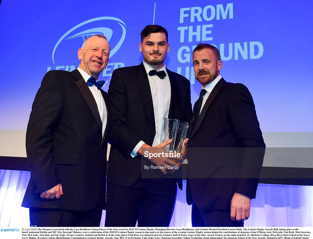 28 April 2019; Max Deegan is presented with the Laya Healthcare Young Player of the Year award by D.O. O’Connor, Deputy Managing Director, Laya Healthcare, and Leinster Branch President Lorcan Balfe. The Leinster Rugby Awards Ball, taking place at the InterContinental Dublin and MC’d by Darragh Maloney, were a celebration of the 2018/19 Leinster Rugby season to date and over the course of the evening Leinster Rugby acknowledged the contributions of departees Seán O’Brien, Jack McGrath, Noel Reid, Mick Kearney, Nick McCarthy, Tom Daly and Ian Nagle. Former Leinster, Ireland and British & Irish Lions player Paul Dean was inducted into the Guinness Hall of Fame. Some of the other Award winners on the night included; St. Michael’s College (Deep River Rock School of the Year), Larry Halpin, Terenure College (Beauchamps Contribution to Leinster Rugby Award), Naas RFC (CityJet Senior Club of the Year), Patrician Secondary School Newbridge (Irish Independent Development School of the Year Award), Suttonians RFC (Bank of Ireland Junior Club of the Year) and Sene Naoupu (Energia Women’s Rugby Award). Photo by Ramsey Cardy/Sportsfile