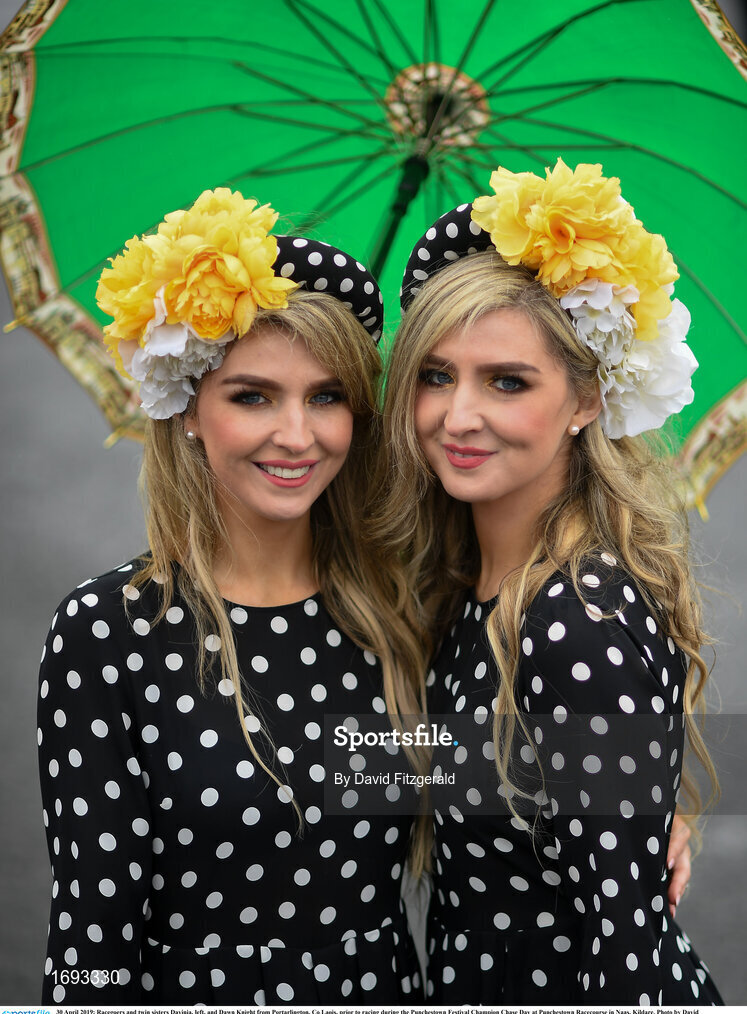 30 April 2019; Racegoers and twin sisters Davinia, left, and Dawn Knight from Portarlington, Co Laois, prior to racing during the Punchestown Festival Champion Chase Day at Punchestown Racecourse in Naas, Kildare. Photo by David Fitzgerald/Sportsfile