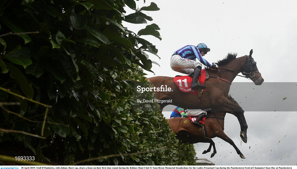 30 April 2019; Troll D'Oudairies, with Johnny Barry up, clears a fence on their first time round during the Kildare Hunt Club Fr Sean Breen Memorial Steeplechase for the Ladies Perpetual Cup during the Punchestown Festival Champion Chase Day at Punchestown Racecourse in Naas, Kildare. Photo by David Fitzgerald/Sportsfile