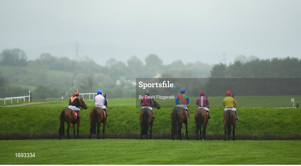 30 April 2019; Runners and riders survey a jump prior to the Kildare Hunt Club Fr Sean Breen Memorial Steeplechase for the Ladies Perpetual Cup during the Punchestown Festival Champion Chase Day at Punchestown Racecourse in Naas, Kildare. Photo by David Fitzgerald/Sportsfile